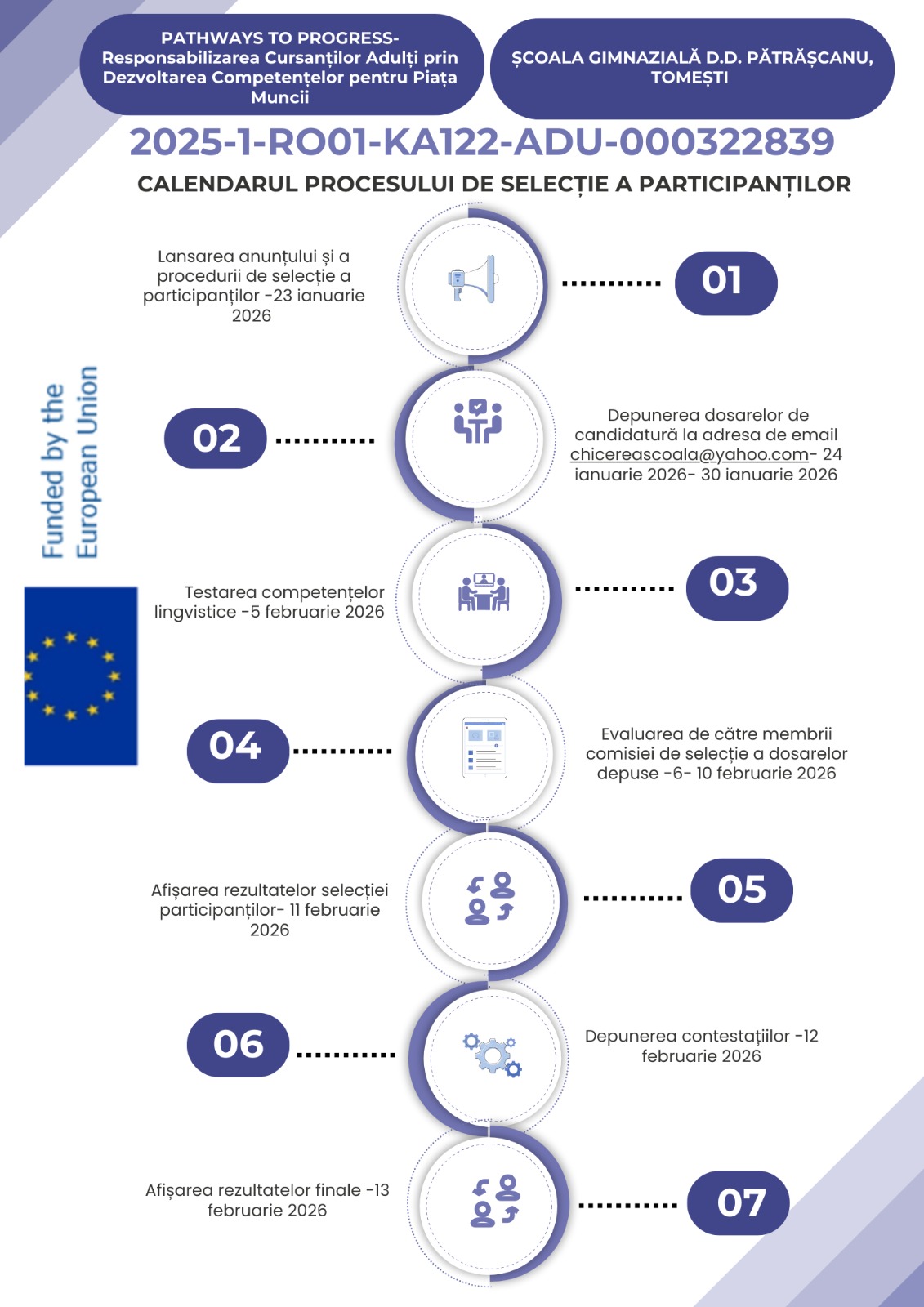 Școala Gimnazială "D. D. Pătrășcanu" Tomești, prin Școala Chicerea implementează, în perioada 16 noiembrie 2025 – 15 noiembrie 2026, un proiect Erasmus+ de tip KA122-ADU – Proiecte pe termen scurt pentru mobilitatea personalului din învățământul școlar, intitulat "PATHWAYS TO PROGRESS- Responsabilizarea Cursanților Adulți prin Dezvoltarea...